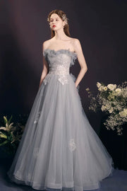 Gray Tulle Beads Long Prom Dress, Lovely A-Line Long Sleeve Evening Dress