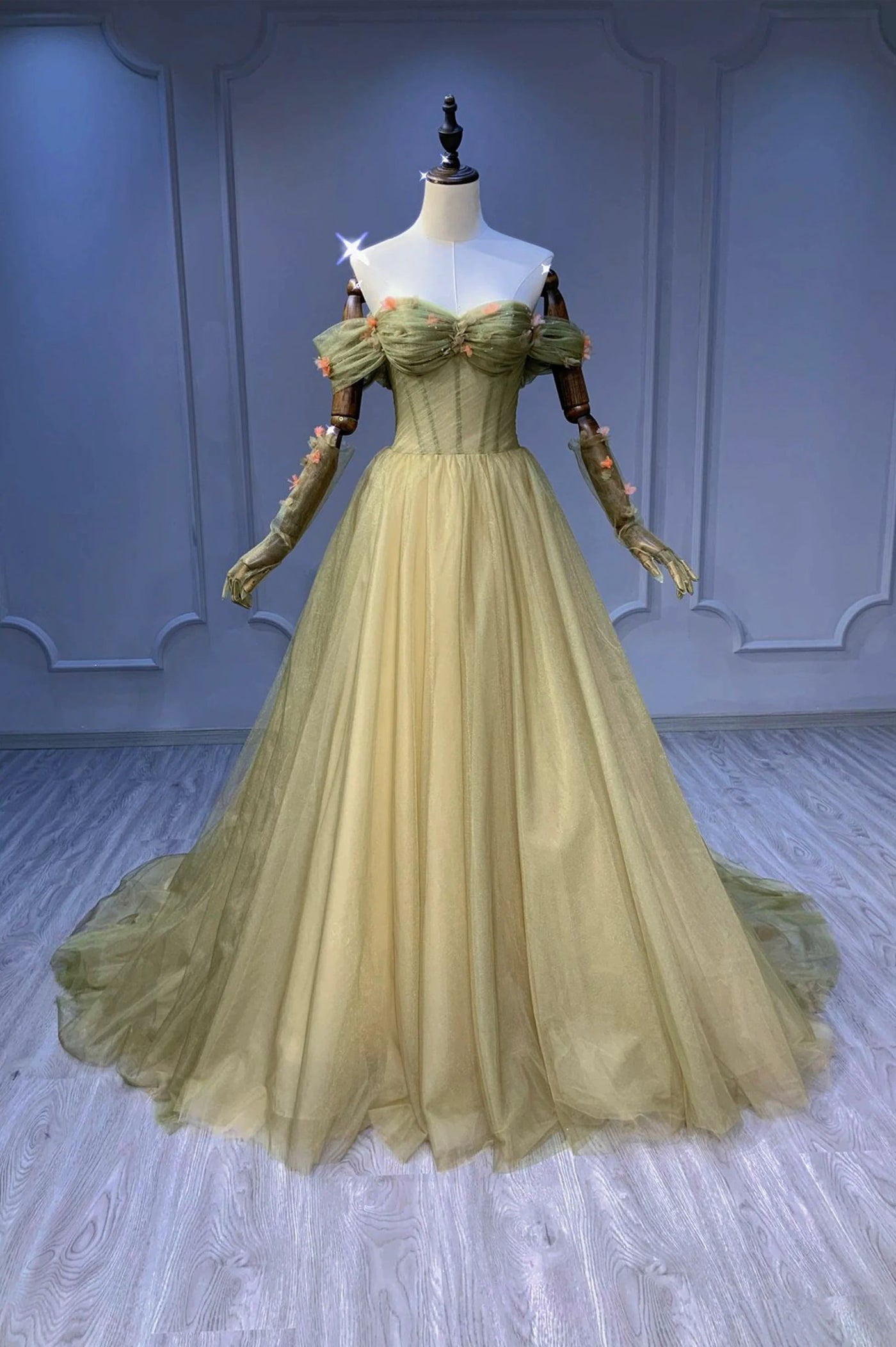 Green Tulle Long A-Line Prom Dress, Off the Shoulder Evening Party Dress