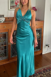 Halter V-Neck Pleated Satin Sleeveless Long Prom Party Dress