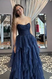 Navy Blue Strapless Tulle A-Line Empire Sparkly Party Prom Dress