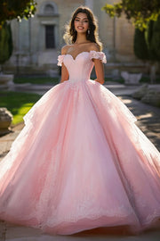 Pink Tulle Ball Gown Off the Shoulder Long Quinceanera Dress with Lace