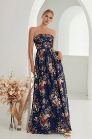 Printed Floral Navy Strapless A Line Long Formal Dress