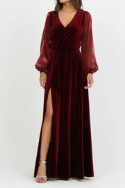 V-Neck Long Sleeves Burgundy A-Line Velvet Dress