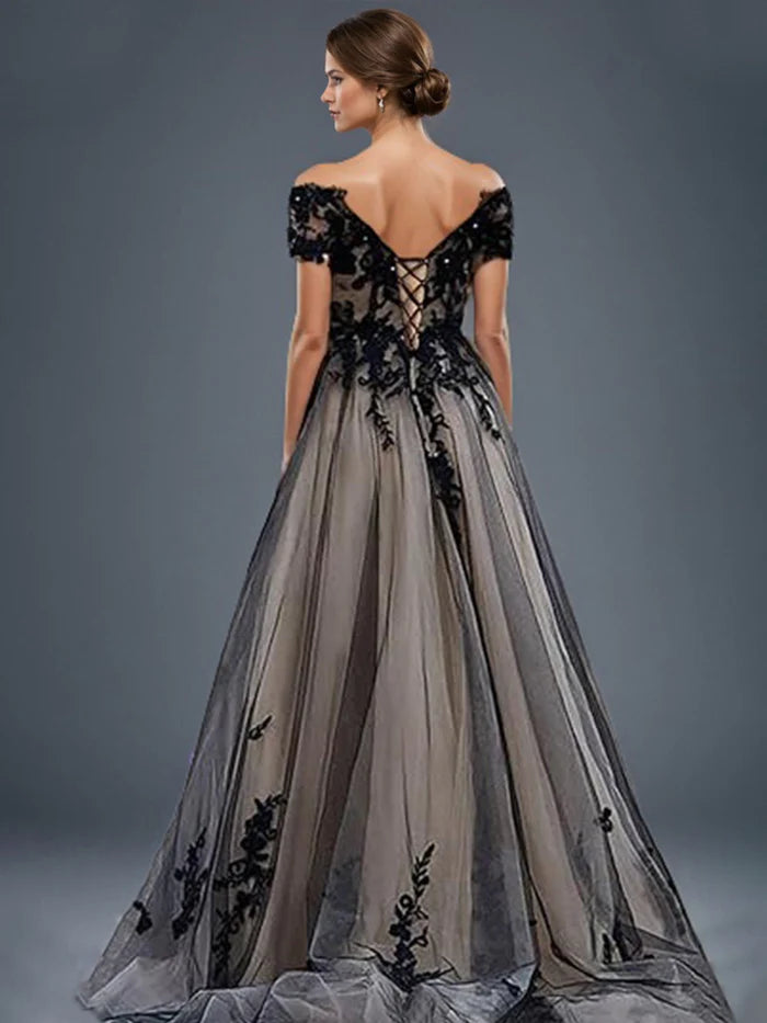 A Line Off The Shoulder Lace Appliques Black Tulle Lace Up Back Prom Dress