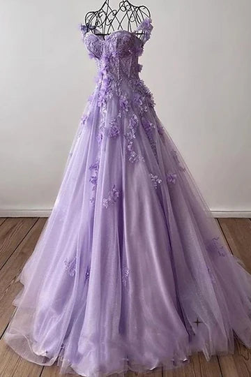 A-Line Strapless Sweetheart Appliques Tulle Long Formal Prom Dress