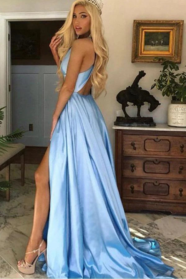 A Line V Neck Open Back Light Blue Full Of Charm Prom Dress
