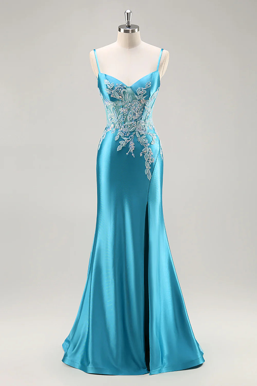 Blue Corset Appliqued Satin Mermaid Long Prom Dress with Slit
