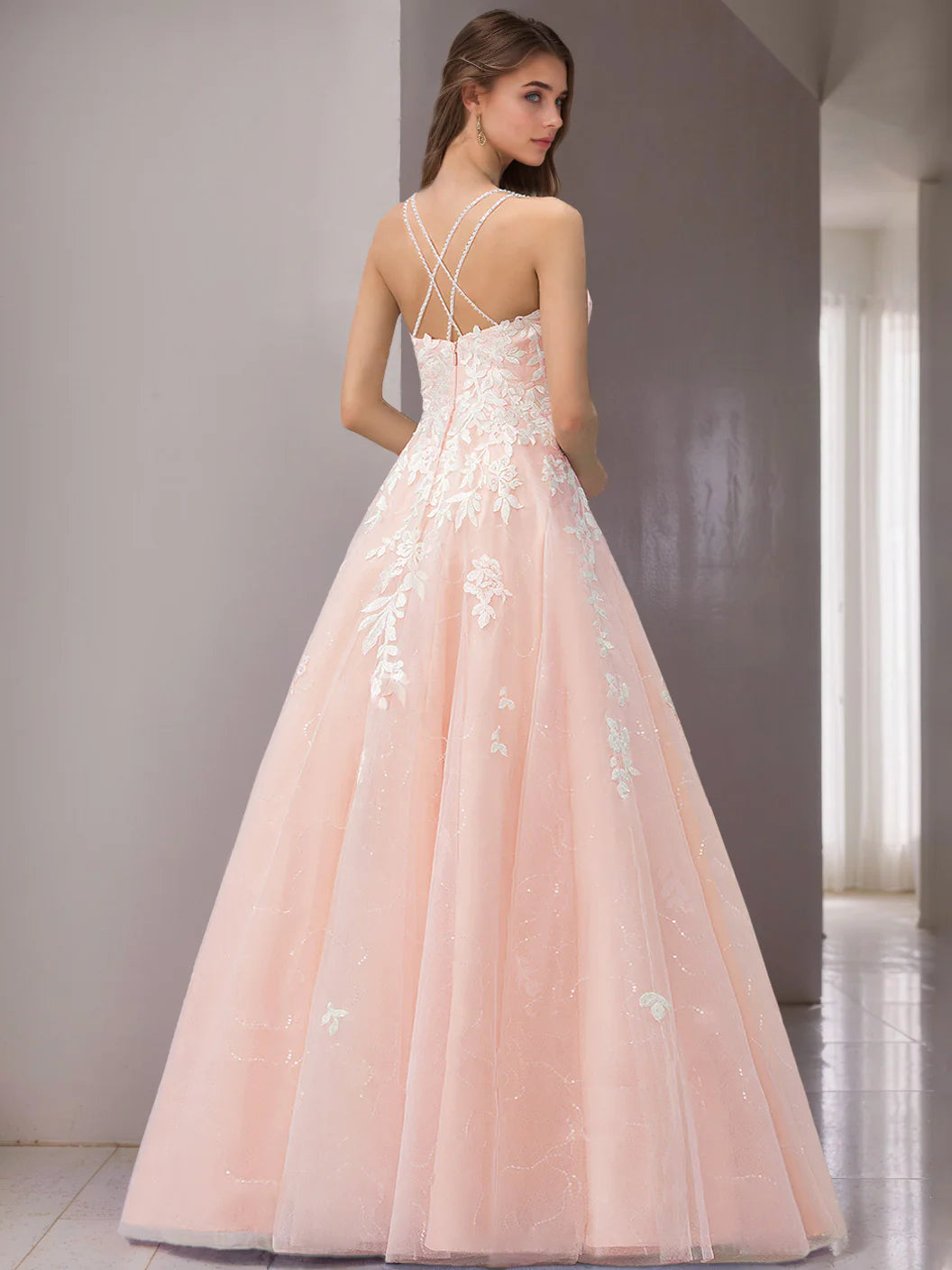 Blush Pink Sequin Tulle Ball Gown Prom Dress with 3D Lace Appliqué, One-Shoulder Neckline & Cross-Back Straps - US 2 / UK 6 / EU 32
