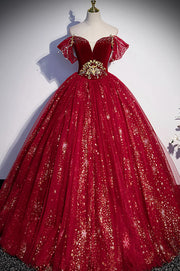 Burgundy Tulle Long A-Line Ball Gown, Off the Shoulder Evening Party Dress