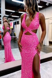 Charming Glitter Mermaid V Neck Hot Pink Sequins Full Of Charm Prom Dress