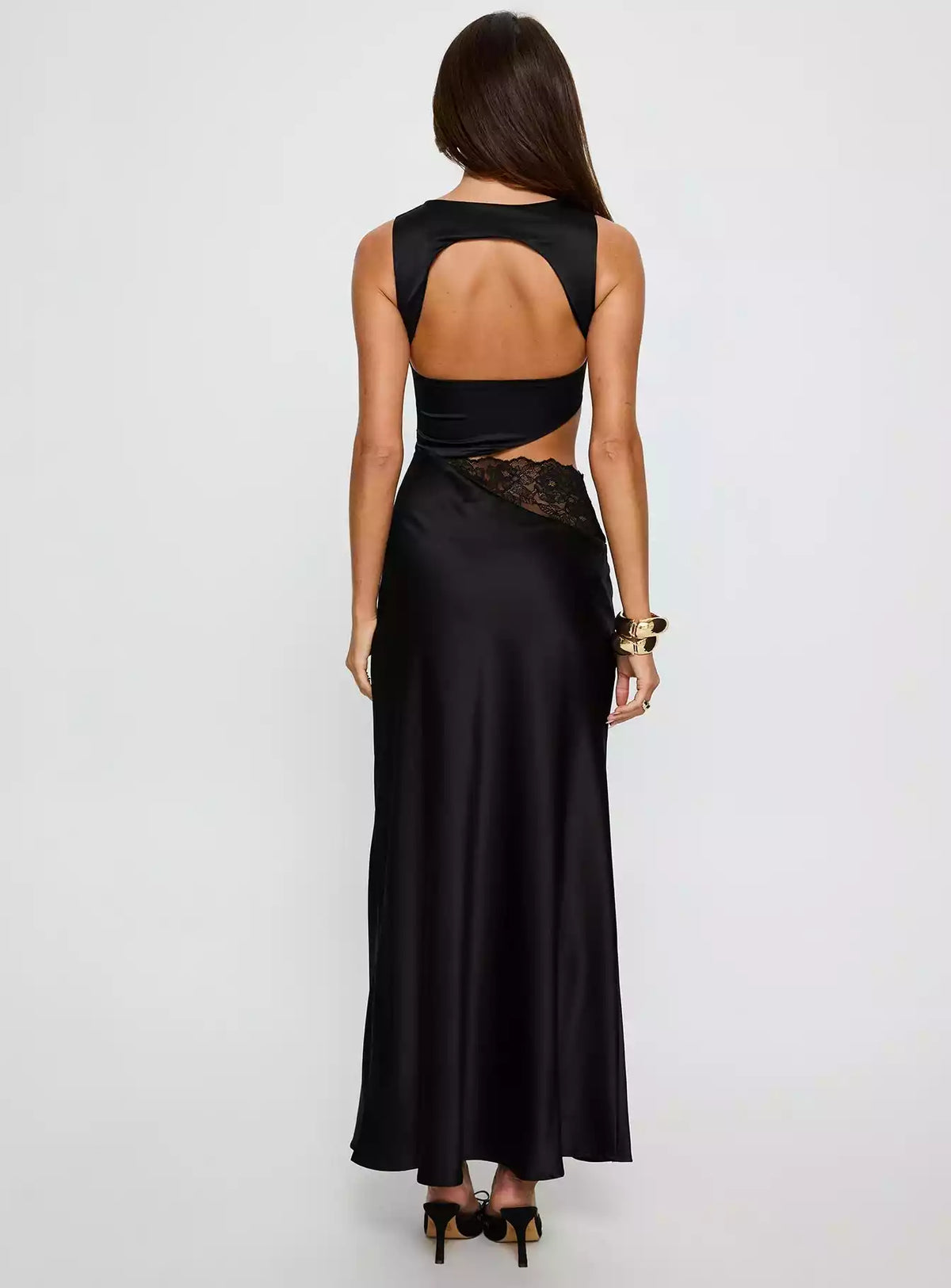 LANQI's charming hollow lace details round neck satin sleeveless side zipper backless fully lined Prom Dresses. This dress is made of satin fabric, featuring a hollowed out backless design, lace stitching, and a waist cut design paired with a long silhouette, showcasing a sexy and high-end style. The satin material has a delicate luster, and the hollow and waist cut design enhances the delicate atmosphere. Lace elements add a soft touch, and the hanging skirt fits the body and naturally displays a cool and gorgeous temperament. It is suitable for high-end dinners, fashion themed parties and other occasions, and is a high-quality choice to showcase fashion taste and sexy style.