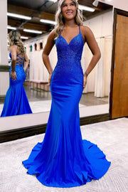 Charming Mermaid Royal Blue Satin Long Full Of Charm Prom Dresses