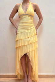 Chic Chiffon A-Line V-Neck Halter Ruffled Party Evening Dress