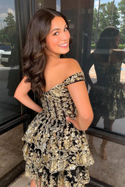 Cute A-Line Off the Shoulder Gold Lace Black Short Homecoming Dresses