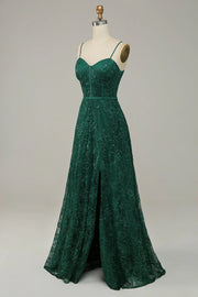 Dark Green Lace Spaghetti Straps Corset Prom Dress