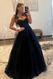Dark Navy A-Line Tie Straps Zipper Back Long Tulle Prom Dress