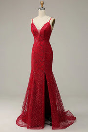 Dark Red Spaghetti Straps Mermaid Prom Dress with Slit