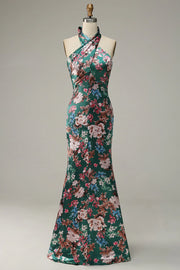 Flower Print Halter Satin Full Of Charm Prom Dress with Slit