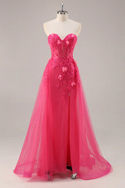 Fuchsia Floral Corset Sweetheart Tulle Long Prom Dress with Slit