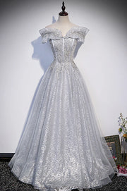 Gray Tulle Beaded Long A-Line Prom Dress, Cute Evening Party Dress