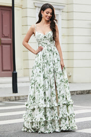 Green A-Line Spaghetti Straps Printed Bridesmaid Dress With Slit