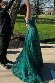 Green Off-Shoulder A-Line Lace Appliques Long Prom Dress with Slit