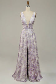 Iovry Purple Printed V-Neck Prom Dress With Slit
