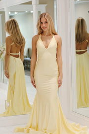Mermaid Halter Backless Yellow Satin Long Full Of Charm Prom Dress