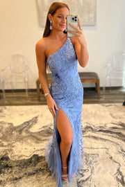 One-Shoulder Periwinkle Applique Long Full Of Charm Formal Dress