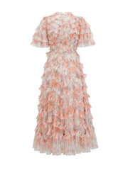 Orange V-neck Short Sleeve Floral Printed Tulle Ruffled Prom Dresses