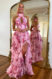 Pink Lovely A-Line Halter Neck Long Retract Your Waist Prom Dress