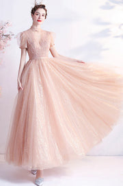 Pink Tulle Beaded Tea Length Prom Dress, A-Line Evening Party Dress - US 2 / UK 6 / EU 32