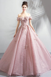 Pink Tulle Lace Long Formal Party Dress, Off the Shoulder Evening Dress - US 2 / UK 6 / EU 32