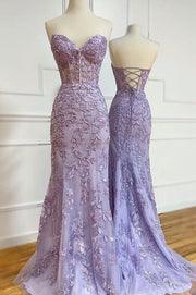 Purple Lace Long Mermaid Prom Dresses, Beautiful Strapless Evening Dresses