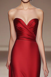 Red Sheath Strapless Pleated Satin Formal Dress With Slit