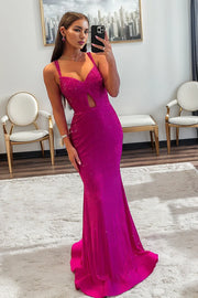 Shiny Fuchsia Mermaid Straps Long Corset Beaded Prom Dress