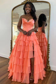Stunning A-Line Sweetheart Satin Top Long Tiered Chiffon Prom Dress with Slit