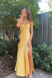 Sunny Yellow Satin Slip Gown with Thin Spaghetti Straps & High Slit