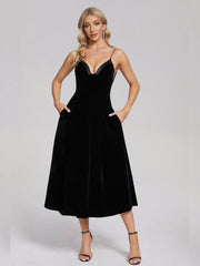 V-Neck Spaghetti Straps Velvet Unique Design Prom Dress