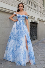 White Blue Flower Off The Shoulder Corset Long Bridesmaid Dress with Slit